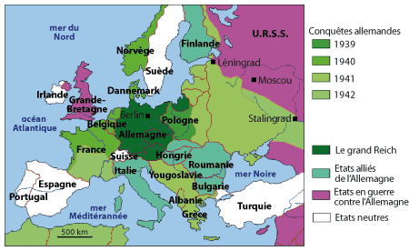 Le 10 mai 1940, hitler envahit les Pays-Bas, la Belgique et le Luxembourg. Les troupes françaises, concentrées massivement dans les Vosges, reviennent précipitament au nord, mais ne peut empêcher la défaite. Rapidement, les Allemand sont aux portes de Paris. Tout le nord de la France et toute la côte Atlantique est occupée. L'armistice est signé le 17 juin 1940. Un nouveau gouvernement dirigé par Pétain se met en place à Vichy, mais fortement influencé par les dirigeants nazis.